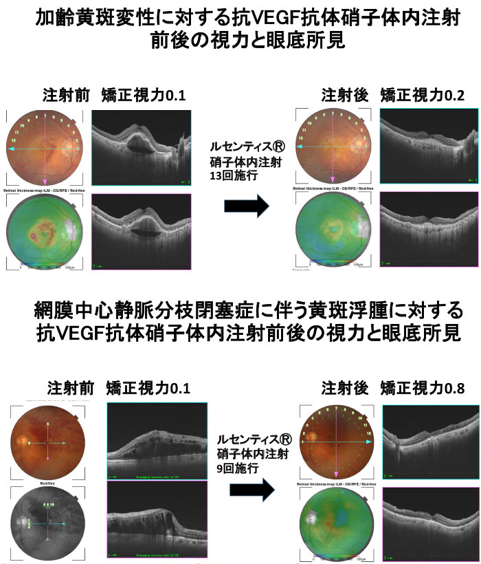加齢黄斑変性、糖尿病黄斑浮腫、網膜中心静脈(分枝)閉塞症に伴う黄斑浮腫、強度近視に伴う新生血管黄斑症などの網膜(カメラのフィルムやCCDにあたる画像の撮影をする部分)の中心部分に浮腫や出血を起こす病気に対して、眼球内に抗VEGF抗体という薬液を注射して治療を行います。