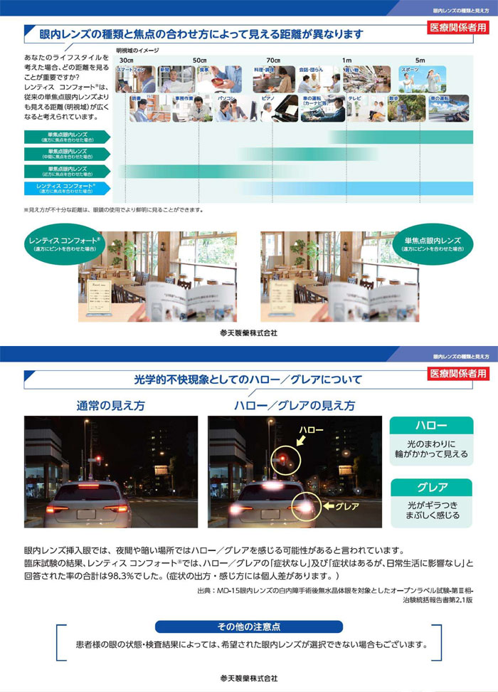 また、以前の2重焦点眼内レンズを含む多焦点眼内レンズでは、薄暗い場所や夜間にライト等を見ると、光の周辺に輪が掛かって見えたり、眩しさを感じたりすることがあるため【ハロー・グレア現象:上図の下側に説明図があります】